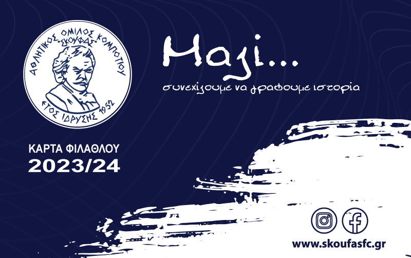 Από σήμερα Δευτέρα (17/07) σε κυκλοφορία η νέα Κάρτα Φιλάθλου του «Α.Ο. Κομποτίου ο ΣΚΟΥΦΑΣ» για τη αγωνιστική περίοδο 2023/24.