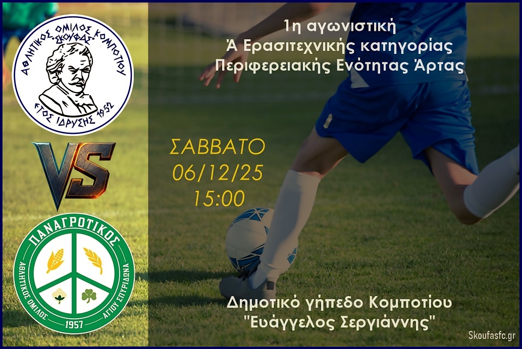 🔹️ Η αυλαία της νέας σεζόν στην Α’ Ερασιτεχνική κατηγορία της Περιφερειακής Ενότητας Άρτας ανοίγει με ένα ιδιαίτερα ενδιαφέρον παιχνίδι για την ομάδα μας Α.Ο. Κομποτίου “Ο ΣΚΟΥΦΑΣ”.